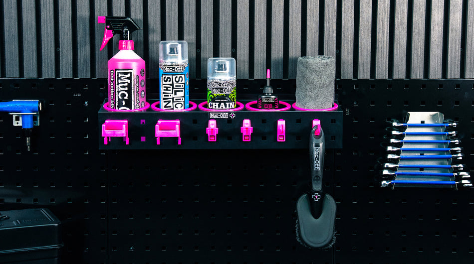 Introducing the Expert Muc-Off Bottle and Detailing Store Rack bundle. functional organiser is the ultimate way to stash your detailing gear and keep those MO favourites within arm’s reach. Designed to hold multiple bottles and aerosols up top, the rack also features clips and hooks, perfect for hanging cloths, brushes, extra bottles, and other cleaning essentials. Crafted from robust materials to handle the demands of any workshop, this rack is as practical as it is stylish. Easily mount it to your workshop or garage wall for a clean, pro-grade set-up that keeps everything tidy and ready for action. With the Muc-Off Rack, your gear stays sorted so you can focus on what matters most: keeping it pinned!