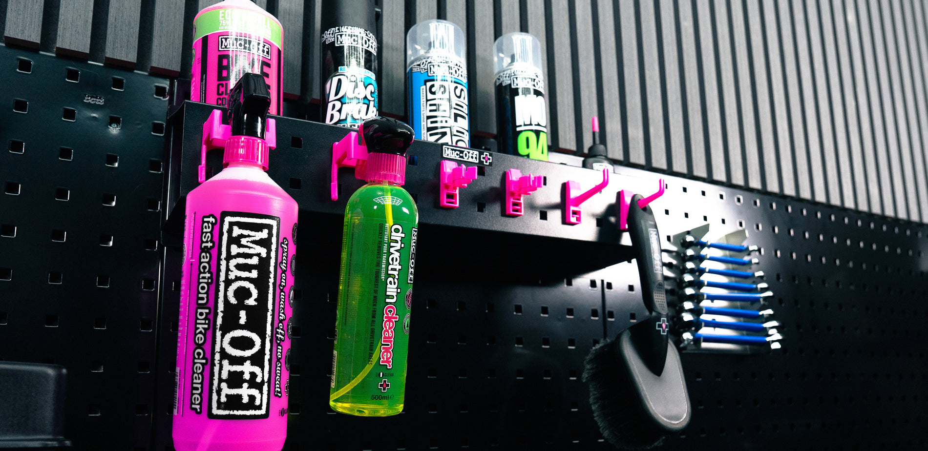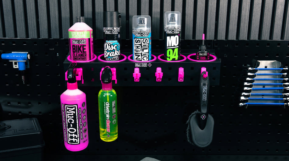 Introducing the Ultimate Muc-Off Bottle and Detailing Store Rack bundle. functional organiser is the ultimate way to stash your detailing gear and keep those MO favourites within arm’s reach. Designed to hold multiple bottles and aerosols up top, the rack also features clips and hooks, perfect for hanging cloths, brushes, extra bottles, and other cleaning essentials. Crafted from robust materials to handle the demands of any workshop, this rack is as practical as it is stylish. Easily mount it to your workshop or garage wall for a clean, pro-grade set-up that keeps everything tidy and ready for action. With the Muc-Off Rack, your gear stays sorted so you can focus on what matters most: keeping it pinned!