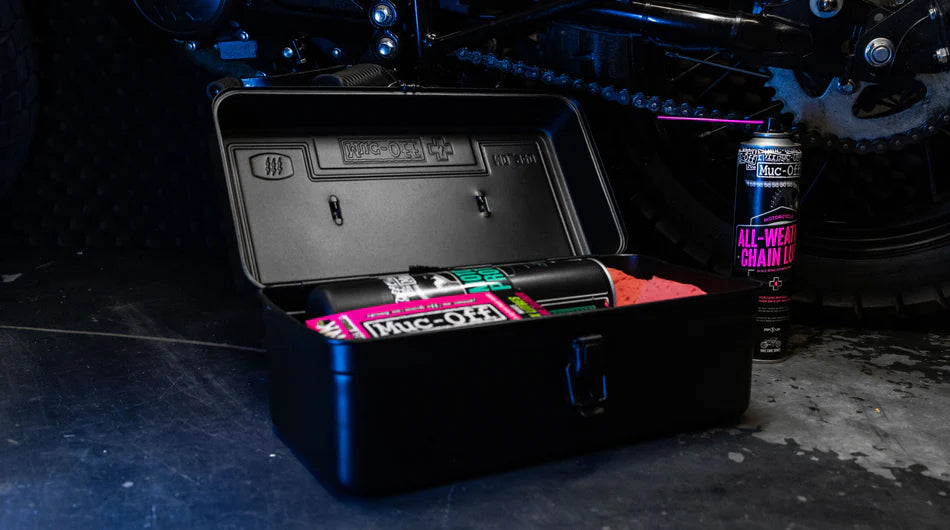 Your Muc-Off haul comes securely wrapped up in our military inspired, eco conscious utility toolbox along with a Muc-Off sticker sheet to customise it. Stash all your MO goodies, tools, and spare parts all in one place. Thanks to the large singe compartment, secure locking system, and grab handle, on-the-go moto care and maintenance has never been so easy or looked so awesome.
