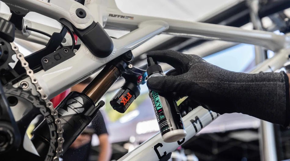 4. Shake bottle to activate formula, then spray a small amount directly onto shocks, stanchions, and/or dropper post