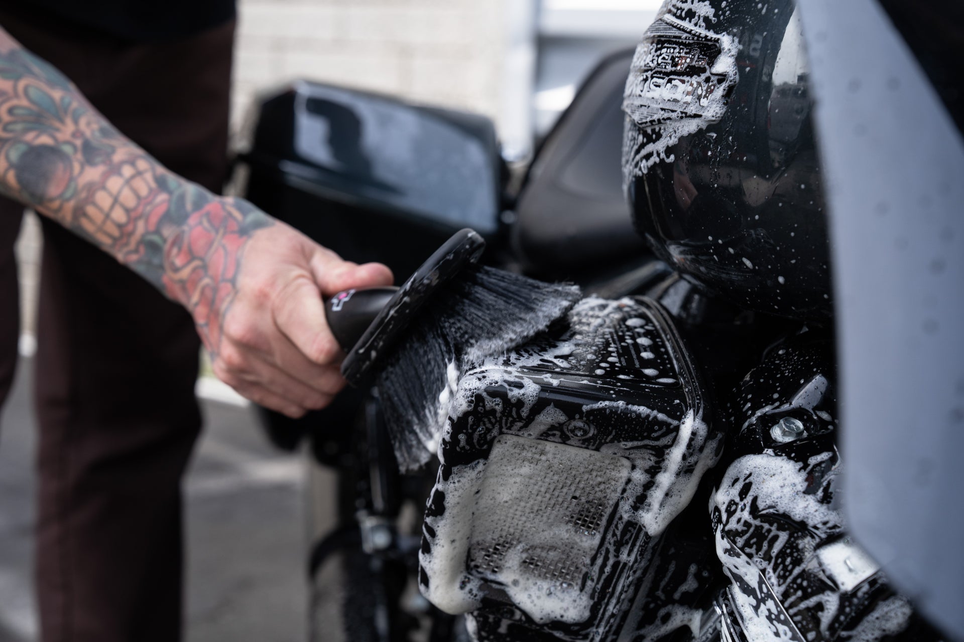 Spray Bike Wash over the entire motorcycle, including paintwork, chrome and engine components, and leave for 3–5 minutes. Do not allow it to dry or apply in direct sunlight.